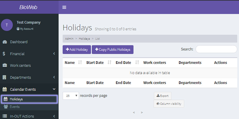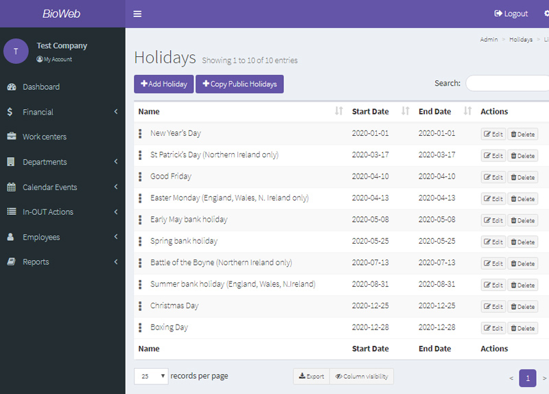 Bioweb has already uploaded several public holiday calendars for employers to ease the configuring of their calendar.