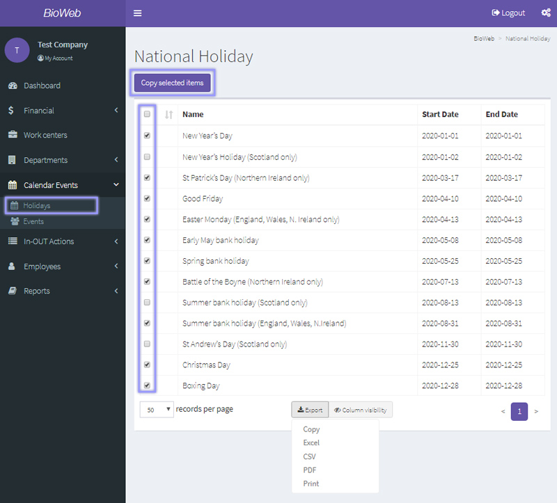 When you have finished with the selction, click on "Copy selected items" button. They will all be copied into the "Holidays" section at "Calendar Events":
