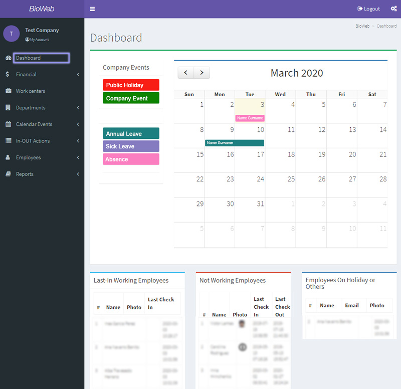 At the "Dashboard" section you get a quick glimpse of the company's monthly calendar overview and a daily attendance overview.