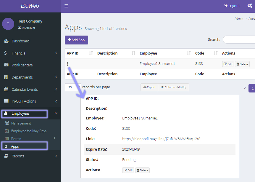 - Code: one use code that the employee has to insert at the app once it is installed in order to access Bioapptil, along with the email address inserted when adding an employee at the "Employee> Management" section.