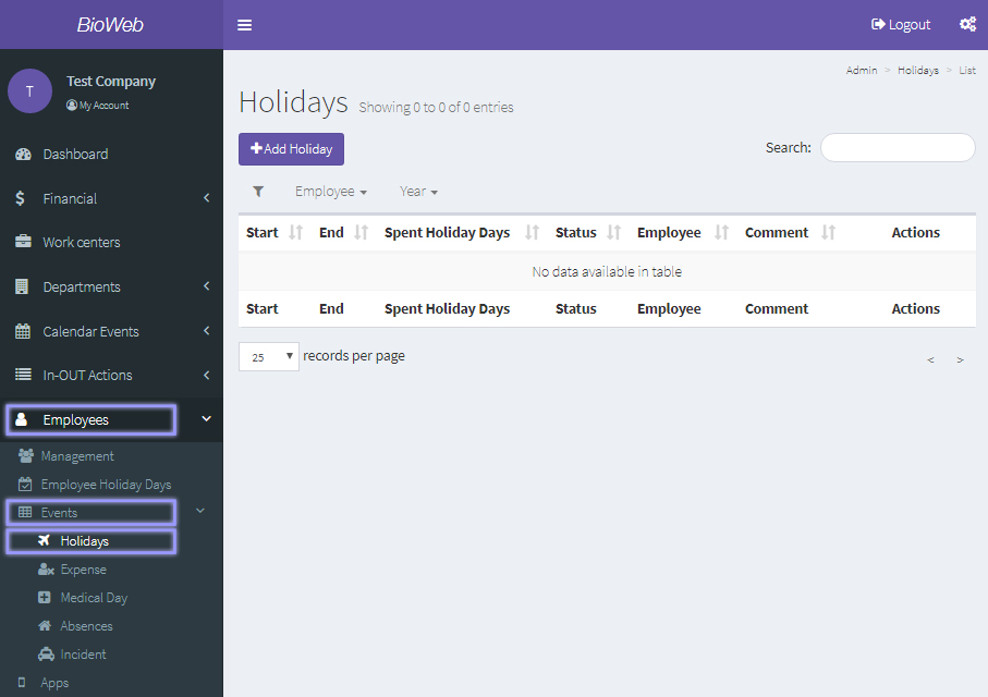 At the left menu, click on "Employees", on "Events" and then on "Holidays".