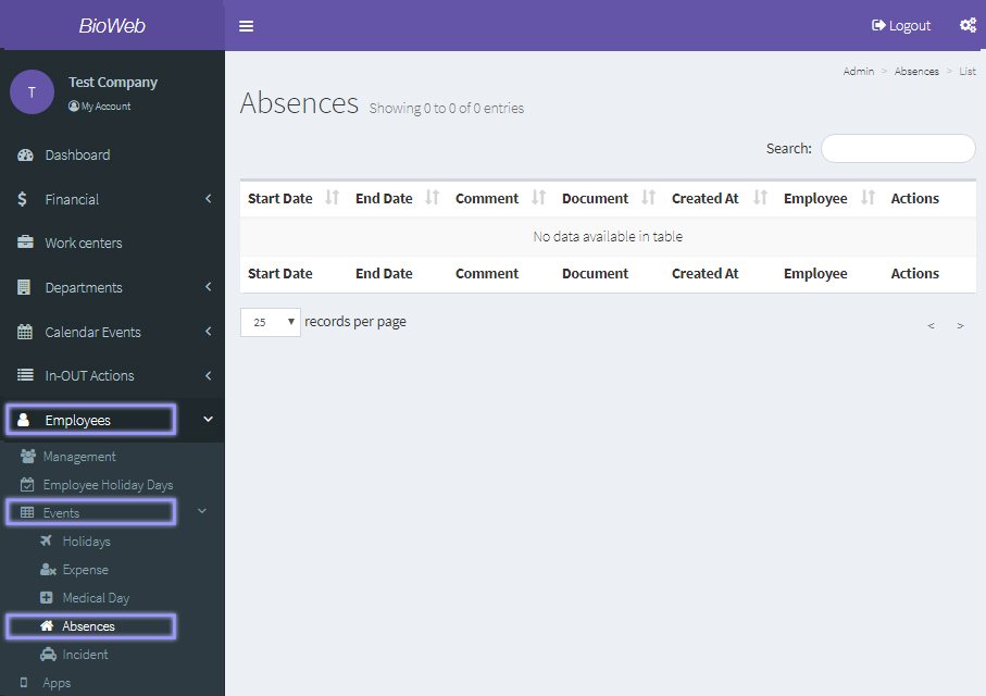 At the left menu, click on "Employees", on "Events" and then on "Absences".
