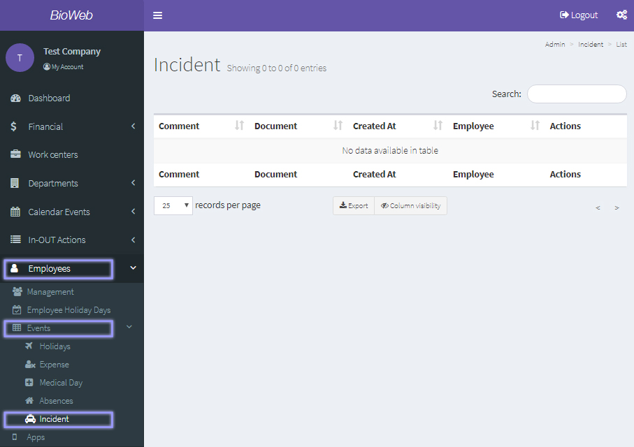 At the left menu, click on "Employees", on "Events" and then on "Incident".