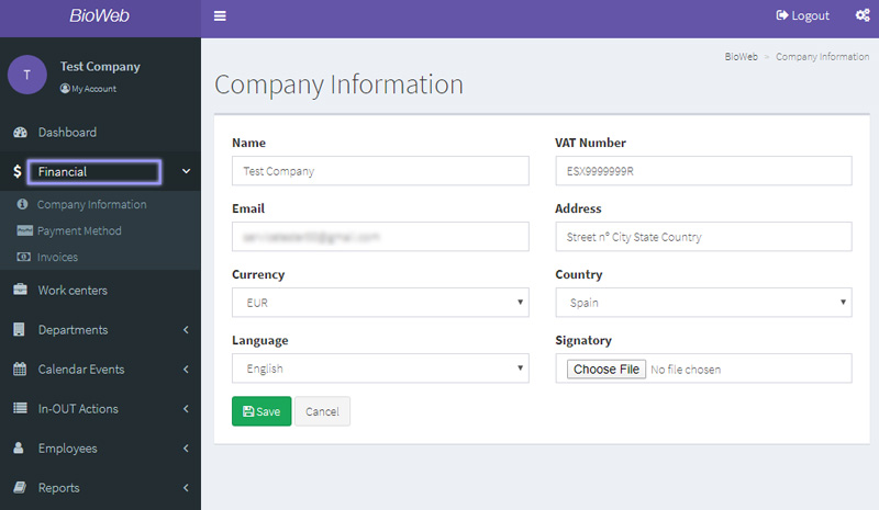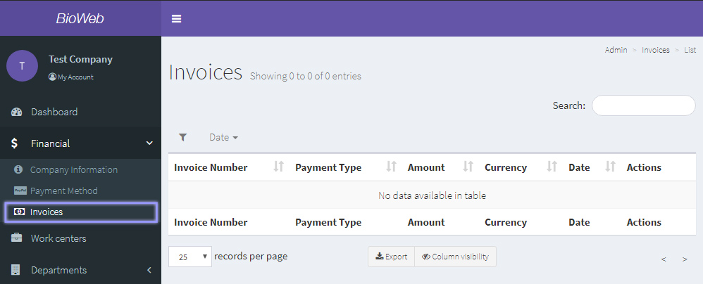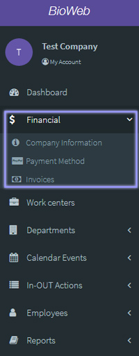 At the "Financial" section you manage the billing of the Bioweb service (billing profile, billing plan, payment method, and invoices).