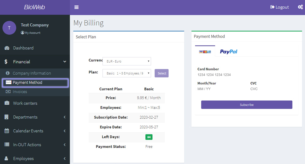 - Payment Method. Bioweb supports payments via credit card and PayPal. Add your payment method here.