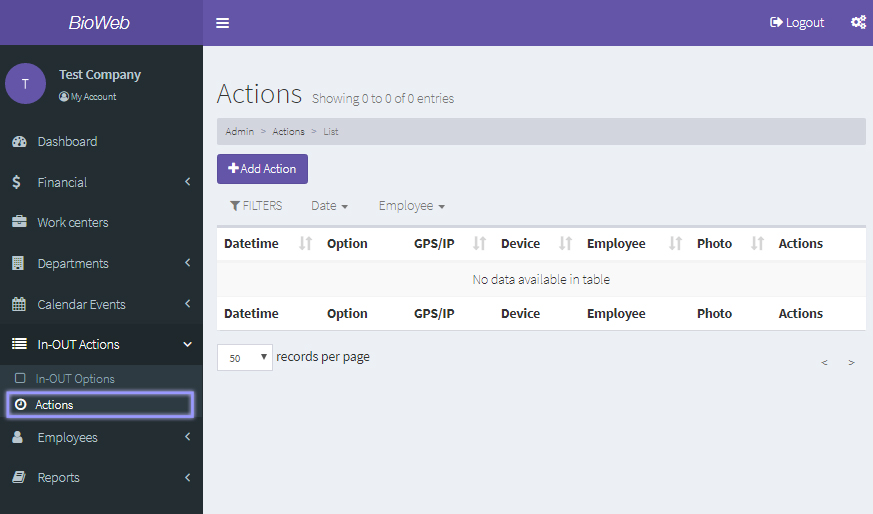 At the "Actions" section at "In-OUT Options" you can see all the time tracking events that users have recorded sorted out by date, record method, IP address or GPS location, device, employee or type of event.