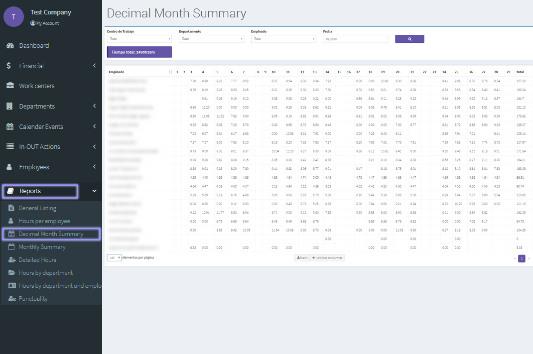 At the "Decimal Month Summary" section at "Reports" you can find a report with the total monthly hours worked and total daily hours worked, by employee. For example: 12:56 (12 hours and 56 minutes).