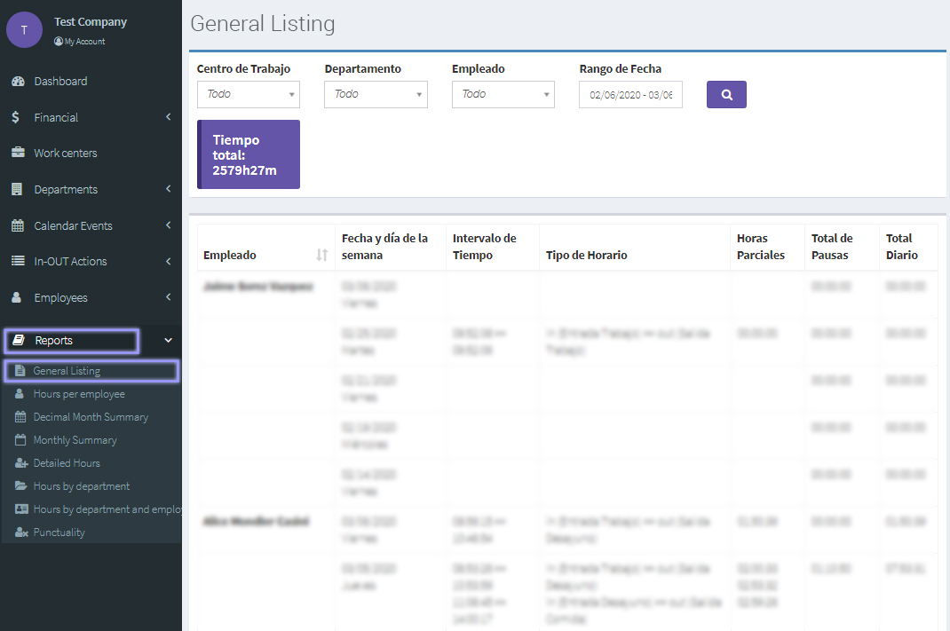 At the "General Listing" section at "Reports" you can find a report with all the time tracks recorded by Bioweb and a total worked hours recount detailed by work center, department, employe, and date range.