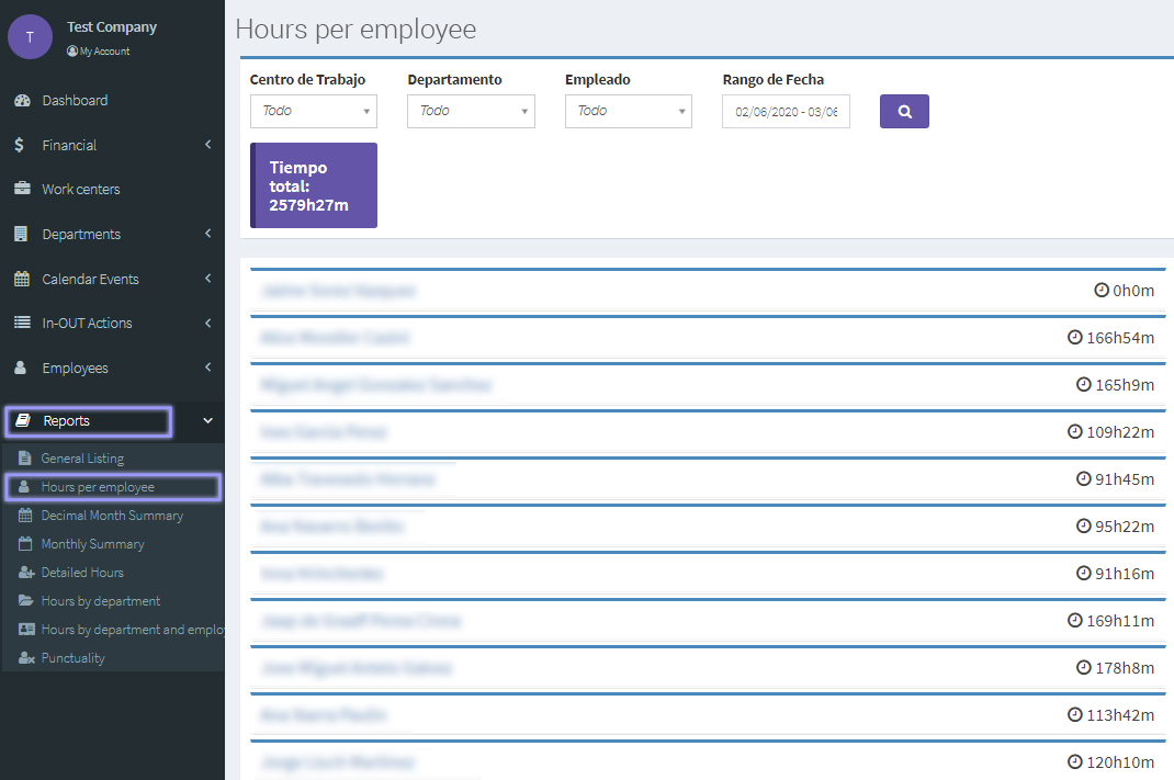 At the "Hours per employee" section at "Reports" you can find a report with the total worked hours recount by employee.