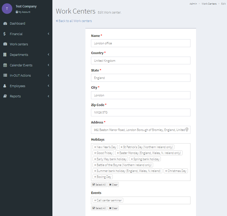 At the "Work centers" section you can manage your business offices.